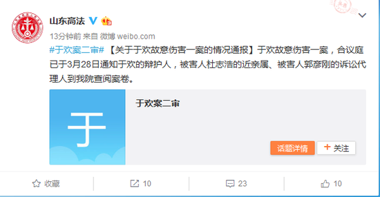 #于欢案二审# [关于于欢故意伤害一案的情况通报]于欢故意伤害一案,合议庭已于3月28日通知于欢的辩护人,被害人杜志浩的近亲属、被害人郭彦刚的诉讼代理人到我院查阅案卷。