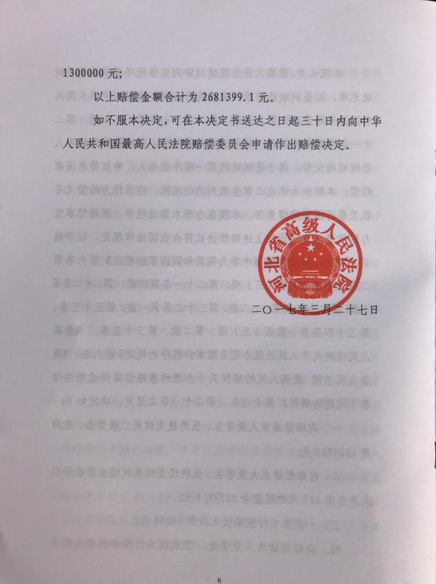 记者今天从河北高院获悉,3月28日,河北高院已向聂树斌父母送达了国家赔偿决定书,据河北高院介绍,在这起国家赔偿案办理过程中,河北高院依据相关法律与赔偿申请人进行了充分协商,双方就赔偿项目和赔偿数额达成了协议,赔偿决定的具体数额如下: