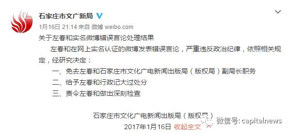 今年1月,左春和被免去石家庄文化广电新闻出版局副局长的职务,原因是在微博发表错误言论,严重违反政治纪律。