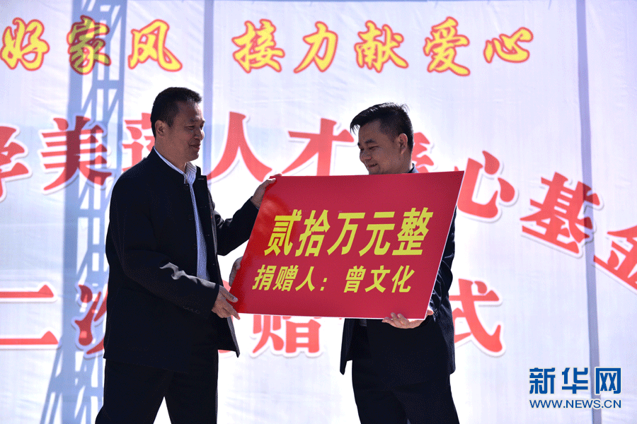 新华网南昌4月2日电(蓝单 通讯员 兰海洋 钟慧燕)4月2日,全南中学校长郑重接过“二十万元”的捐赠牌,这笔爱心善款,来自该县杰出乡贤曾文化。他用这种特殊的方式寄托哀思追忆母亲,替母亲续交“特殊党费”——给“美莲人才爱心基金”增加20万元捐款,以此度过一个“别样的清明节”。