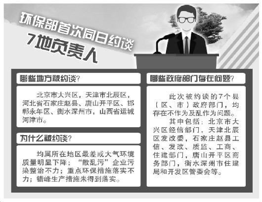 同一天约谈北京、天津、河北以及山西4省(市)7个县(市、区)的政府主要负责人,这在环保部的历史上还是首次;而由以往约谈多为地(市)级政府主要负责人变为县(市、区)一把手所传递出来的信息无疑是环保部约谈力度在升级。