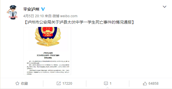 未来网记者注意到,这是4月1日泸县太伏中学学生死亡案后,泸州市公安局首次公开回应。