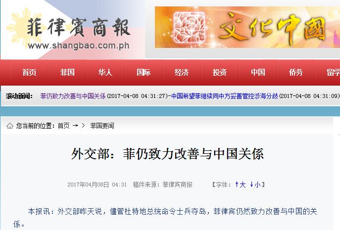 [环球网报道 记者 张骜]《菲律宾商报》4月8日报道称,菲外交部7日表示,尽管总统杜特尔特“命令士兵夺岛”,菲律宾仍然致力改善与中国的关系。