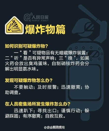 【全民国家安全教育日:你必须了解的反恐基本常识】4月15日是我国“全民国家安全教育日”。当国家安全和我们的生命安全受到恐怖袭击威胁时,你知道该如何理性应对吗?怎样识别可疑爆炸物?公车上遇纵火怎么逃生?烧伤骨折等该如何自救?…