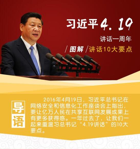 2016年4月19日,习近平总书记在网络安全和信息化工作座谈会上指出,要让亿万人民在共享互联网发展成果上有更多获得感。一年过去了,让我们一起来重温习总书记“4.19讲话”的10大要点。