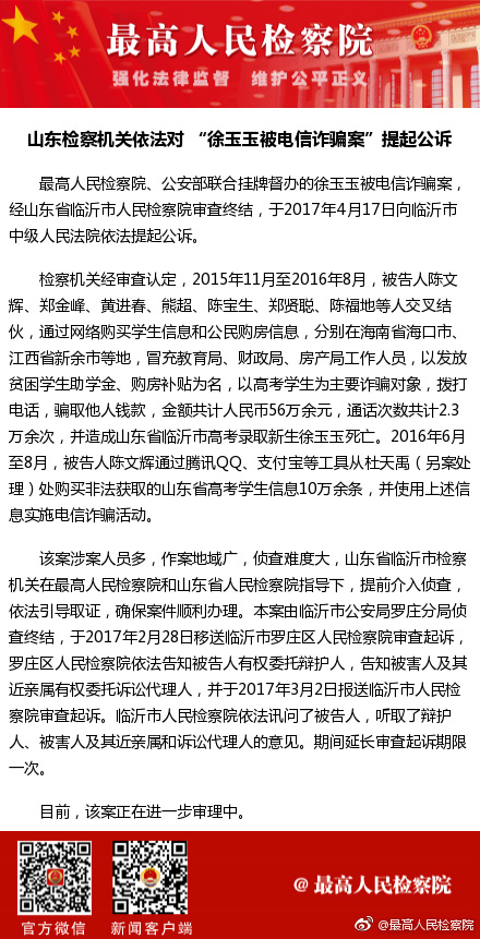 最高人民检察院微信公号4月17日消息,最高人民检察院、公安部联合挂牌督办的徐玉玉被电信诈骗案,经山东省临沂市人民检察院审查终结,于2017年4月17日向临沂市中级人民法院依法提起公诉。