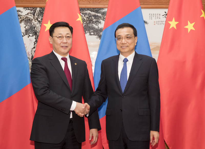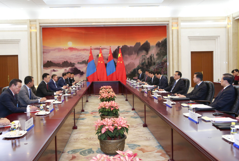 李克强表示,中蒙两国是友好邻邦和全面战略伙伴。双方要继续本着相互尊重、平等相待的原则,切实尊重彼此核心利益和重大关切,巩固中蒙关系的政治基础。我们愿加快“一带一路”倡议同蒙方“发展之路”战略对接,加大对跨境口岸建设和跨境经贸合作的投入,做好中蒙自贸区联合可行性研究相关工作,提升两国经贸合作水平。落实好住宅建设、农畜产品深加工、能源资源利用等领域达成的合作共识,更好实现互利共赢、共同发展。