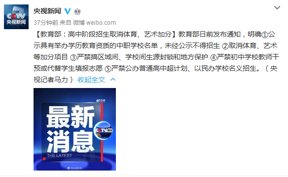 【教育部:高中阶段招生取消体育、艺术加分】教育部日前发布通知,明确①公示具有举办学历教育资质的中职学校名单,未经公示不得招生 ②取消体育、艺术等加分项目 ③严禁搞区域间、学校间生源封锁和地方保护 ④严禁初中学校教师干预或代替学生填报志愿 ⑤严禁公办普通高中超计划、以民办学校名义招生。
