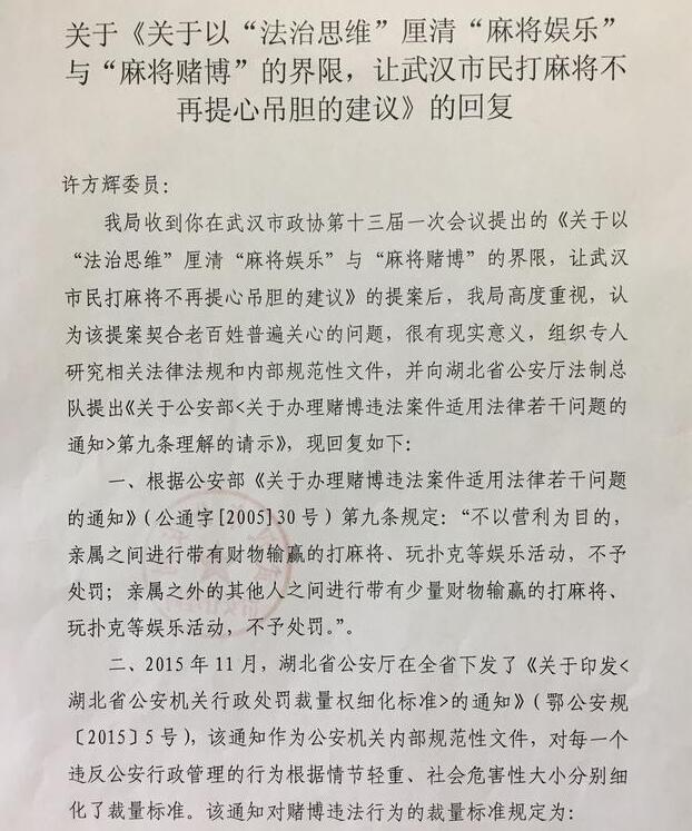 5月17日,全国首例“麻将政协提案”获武汉市公安局治安管理局回复。