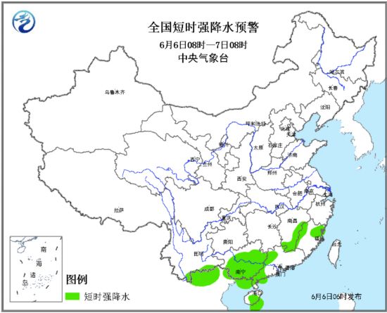 预计6月6日08时至7日08时,广西中部和江西南部等地的局部地区有雷暴大风或冰雹天气;江西东南部、福建东北部、广西大部、广东北部和西部、云南东部和海南南部等地的部分地区有短时强降水天气,小时雨量20-40毫米,局地可达70毫米。