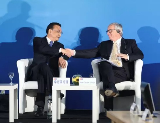当地时间6月2日上午,李克强总理与欧盟委员会主席容克在比利时首都布鲁塞尔埃格蒙宫共同出席第十二届中欧工商峰会并发表演讲。新华社 发