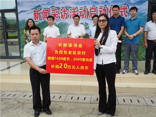 中国网/中国发展门户网讯(记者 江萍)6月5日,由国家互联网信息办公室指导、中国互联网新闻中心主办的“镜头中的脱贫故事:走进百色”活动,在广西壮族自治区百色市启动。启动仪式上,农桥网总经理王晓萍代表农桥读书会,向百色市捐赠价值20万元的1600套图书和2000张光盘。
