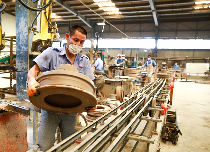 工人们正在用伴生粘土制作特高压瓷绝缘子。