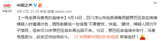 [一场全屏马赛克的追悼会]6月14日,四川凉山布拖县缉毒民警贾巴伍各在搜捕嫌疑人时遭遇伏击,牺牲前最后一句话是“不要管我,快追。”最终,嫌疑人阿约干子落网,但年仅34岁贾巴伍各却再也回不来。16日,贾巴伍各追悼会举行,马赛克是因为,战友还将继续战斗。