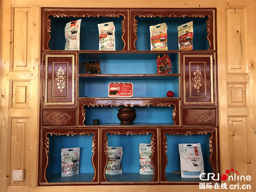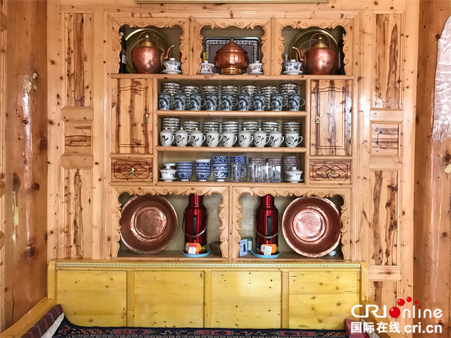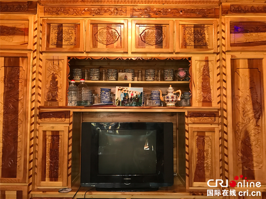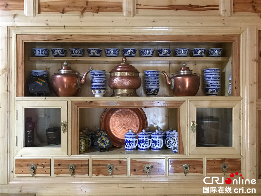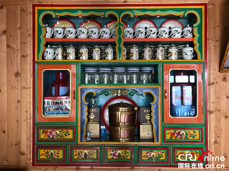 国际在线消息(记者 刘华桢 朱梅):在甘南藏区,几乎每户藏民家的客厅里都会有这样一个开放式的壁橱,上面整整齐齐地摆放着瓷制的碗碟、茶壶、盖碗,铜制的水壶、暖锅、面盆,也许有点零食,也许还有几瓶珍藏的好酒,有的人家让它兼了电视柜的功能,有的人家还会放上一张全家福,温馨满满。