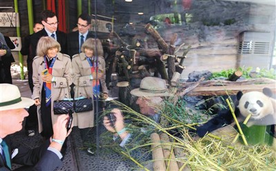 图为7月5日在柏林动物园内的大熊猫馆,参观者在围观大熊猫“梦梦”。当日,来自中国的“梦梦”和“娇庆”在位于柏林动物园内的大熊猫馆正式亮相。