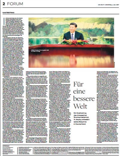 7月4日,在对德国进行国事访问并出席二十国集团领导人第十二次峰会前夕,习近平在《世界报》发表题为《为了一个更加美好的世界》的署名文章。