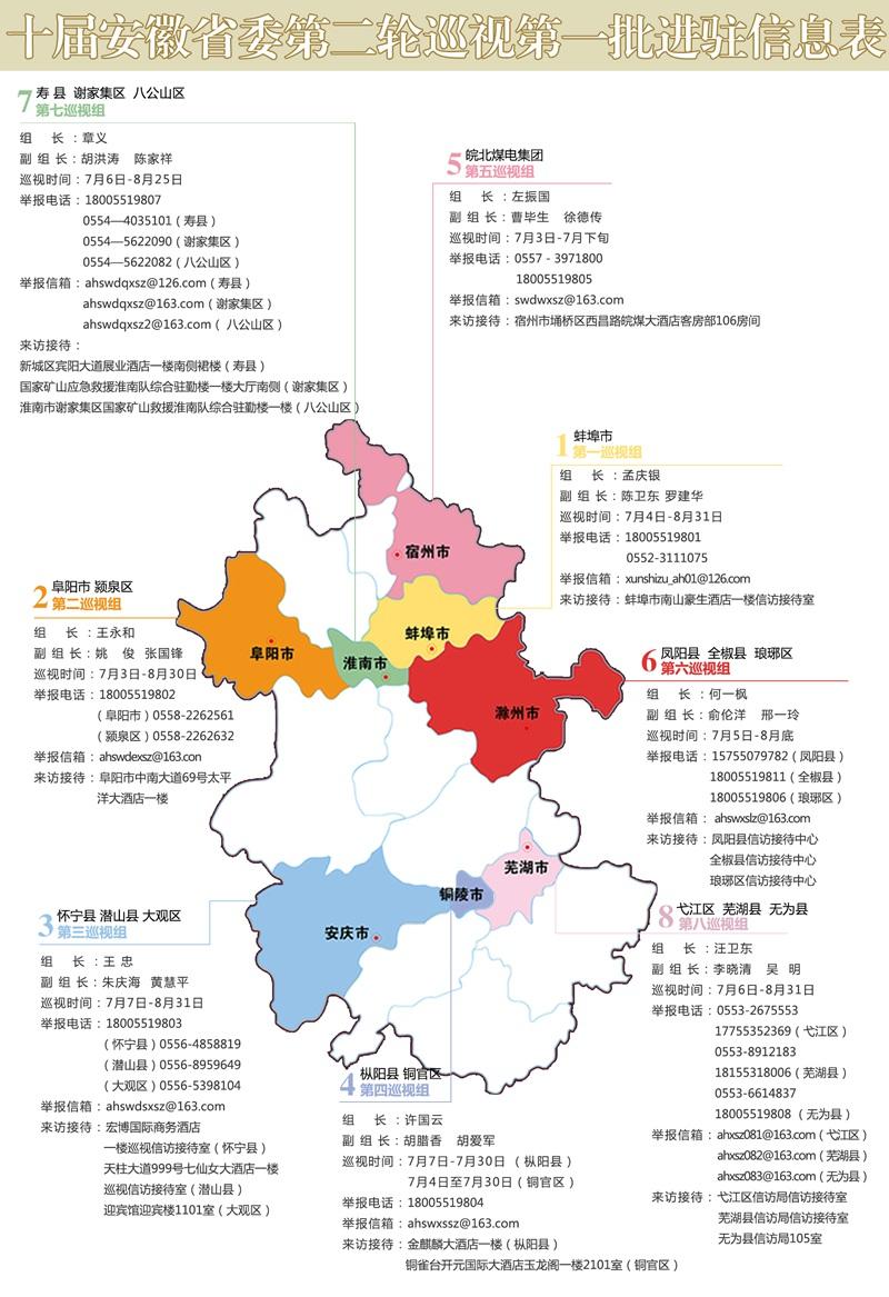 现将十届安徽省委第二轮巡视第一批进驻的各巡视组负责人、巡视时间、举报电话、举报信箱、来访接待地址予以公布。