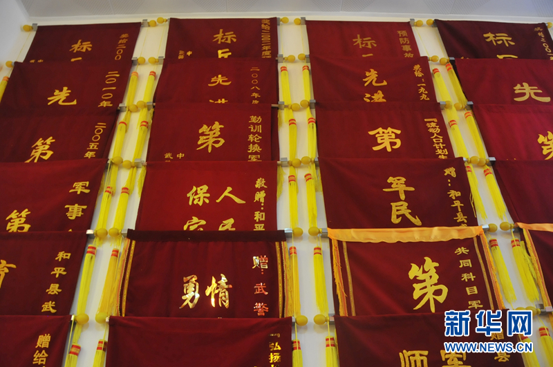 7月18日,网络媒体国防行记者团参观武警广东总队河源市支队和平县中队。图为中队荣誉室中摆放着的部分锦旗。新华网记者 黄河摄