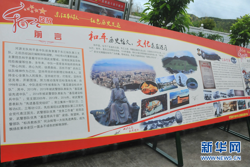 7月18日,网络媒体国防行记者团参观武警广东总队河源市支队和平县中队。图为营区院内介绍中队历史的展板。新华网记者 黄河摄
