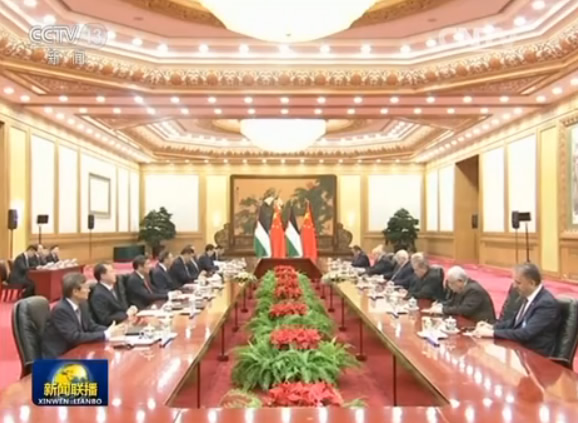 央视网消息(新闻联播):欢迎仪式后,习近平主席在人民大会堂同阿巴斯总统举行会谈。