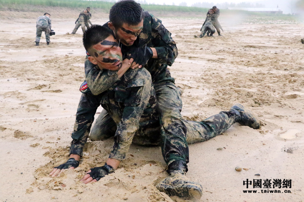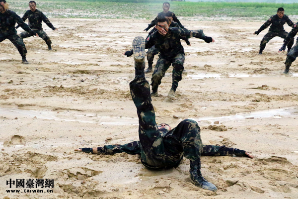 第78集团军某特战旅战士在雨中进行捕俘拳科目演练。(中国台湾网 陈佳慧 摄)