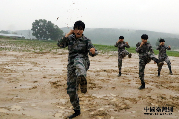 第78集团军某特战旅女兵在雨中进行捕俘拳科目演练。(中国台湾网 陈佳慧 摄)