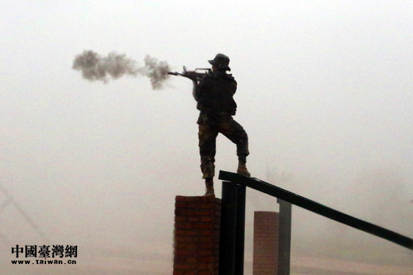 参加反恐演练的第78集团军某特战旅战士在浓烟中掩护射击。(中国台湾网 陈佳慧 摄)