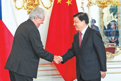 7月16日至19日,应捷克社会民主党副主席、众议长哈马切克邀请,中共中央政治局常委、中央书记处书记刘云山对捷克进行正式友好访问。这是7月18日,刘云山在布拉格会见捷克总统泽曼。
