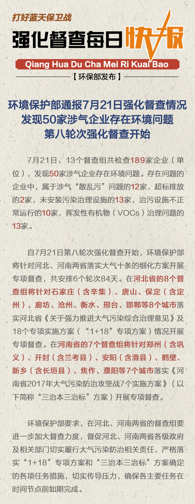 自7月21日第八轮次强化督查开始,环境保护部将针对河北、河南两省落实大气十条的细化方案开展专项督查,共安排6个轮次84天。