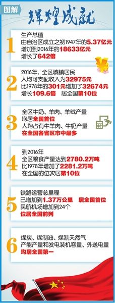 乘着扶持政策的“东风”,卫生事业发展成就瞩目,人均预期寿命已升至75.8岁;教育事业快速发展,形成了覆盖城乡、层次齐全的现代化办学体系;经济规模实现了“蝶变新生”,生产总值由自治区成立之初1947年的5.37亿元增加到2016年的18633亿元,增长了642倍。