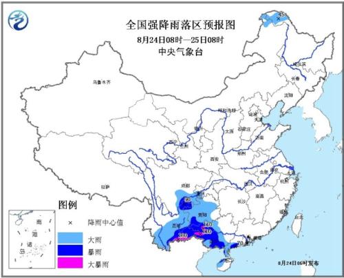 人民网北京8月24日电 中央气象台8月24日06时发布暴雨黄色预警:预计8月24日08时至25日08时,广东西南部、广西西部和南部、海南岛西北部、云南南部和东部、四川东南部、贵州大部等地有大到暴雨,其中,广西西部、云南东南部等地的部分地区有大暴雨(100~180毫米),上述大部地区有短时强降水,小时最大降水量50~70毫米。