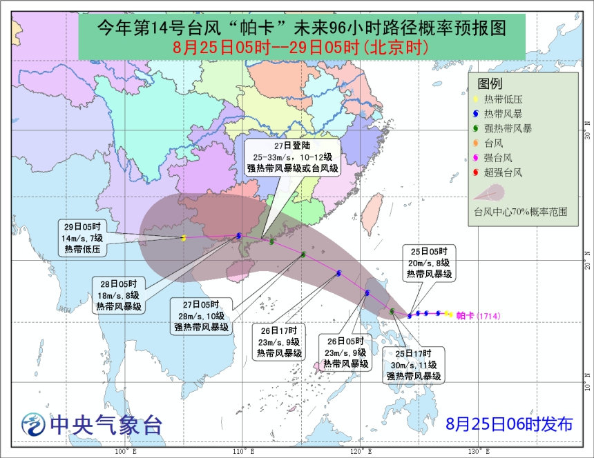 8月25日08时至8月26日08时,巴士海峡、南海东部和台湾东南部海域将有6~7级大风,巴士海峡南部及“帕卡”中心经过的南海东部部分海域风力可达8~10级,阵风11~12级。