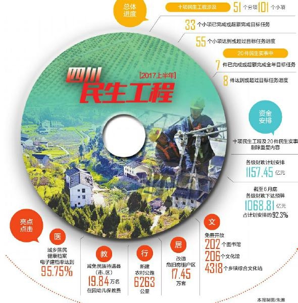 8月初,四川省政府督查室发布上半年四川省民生工程完成情况显示,上半年十项民生工程涉及的51个分项101个小项中,有33个小项已完成或超额完成目标任务,55个小项达到或超过目标任务进度。20件民生实事中,有7件已完成或超额完成全年目标任务,8件达到或超过目标任务进度。