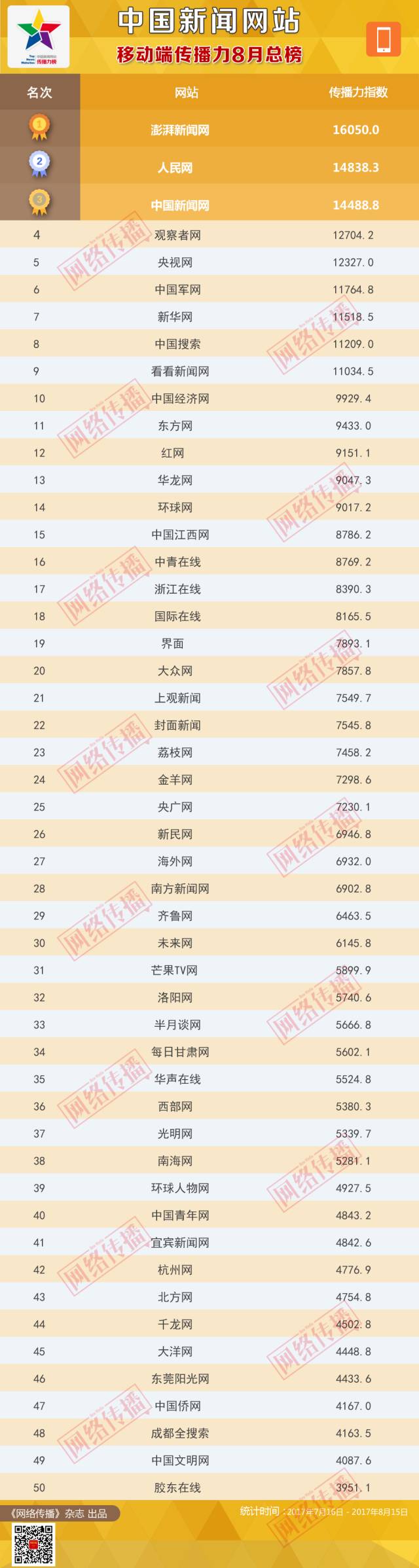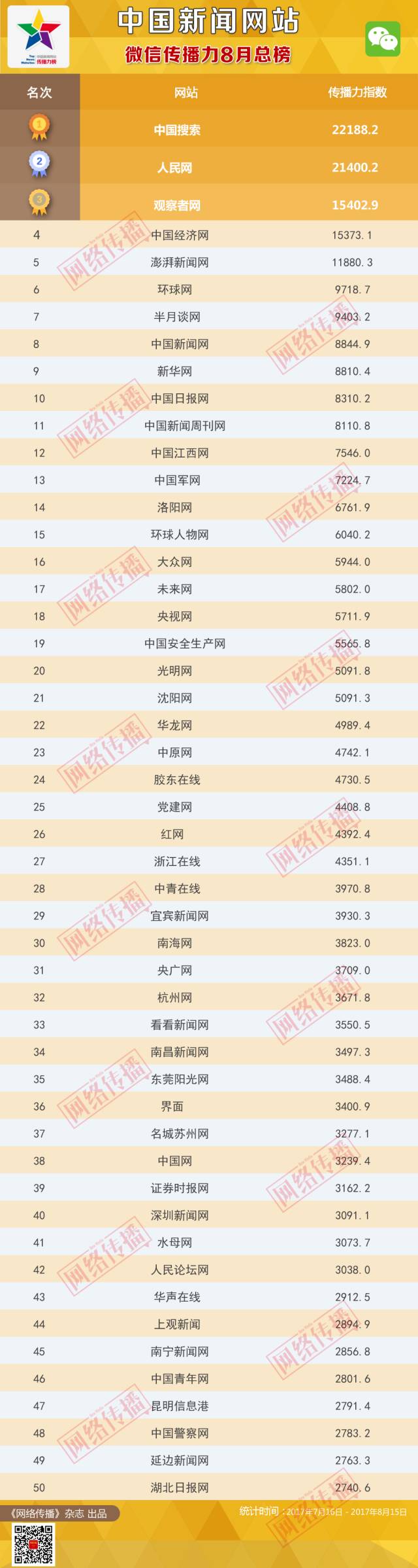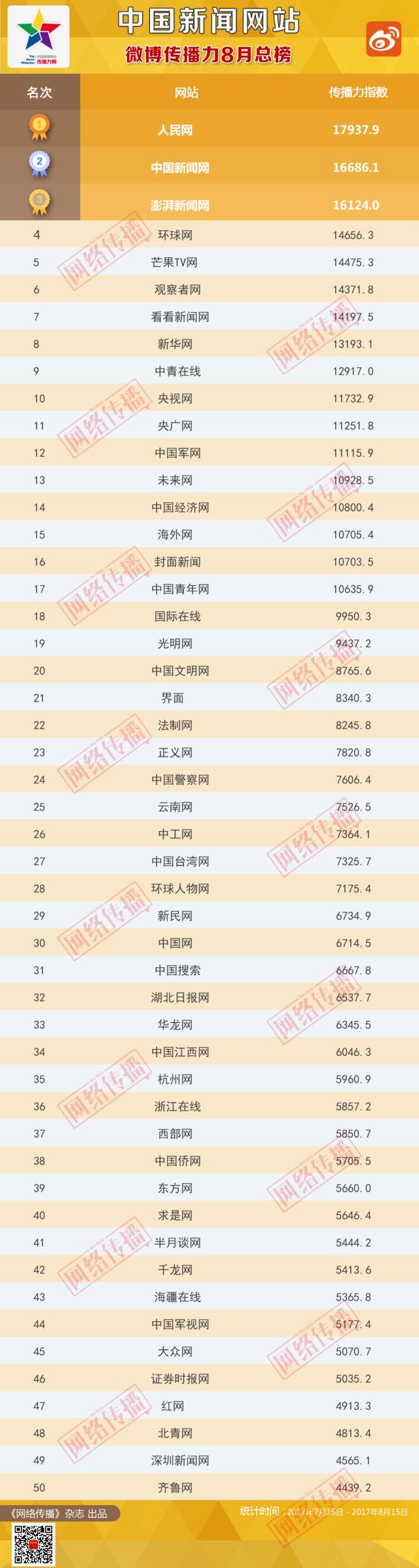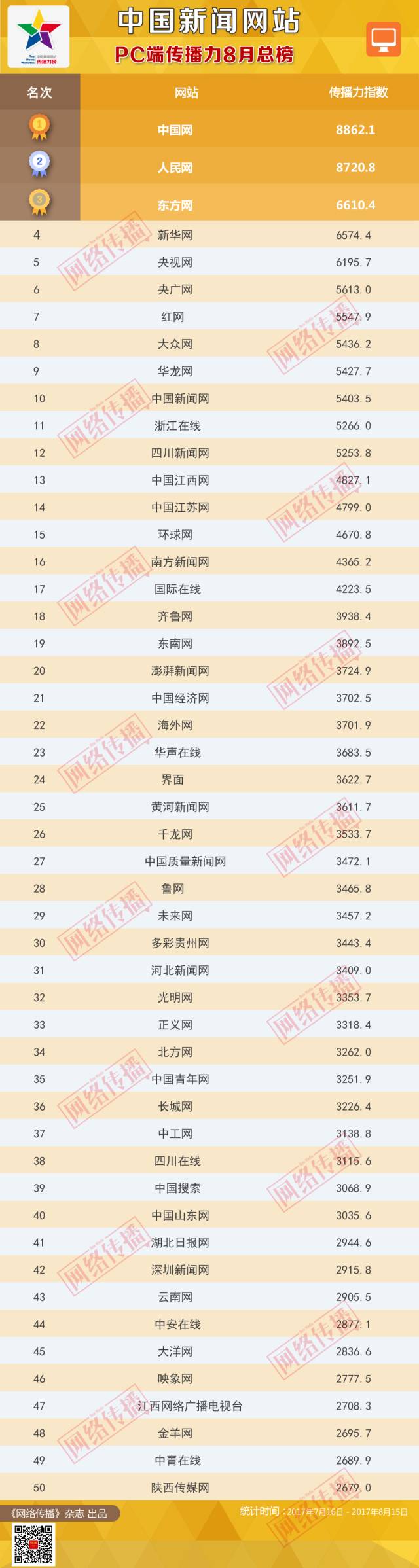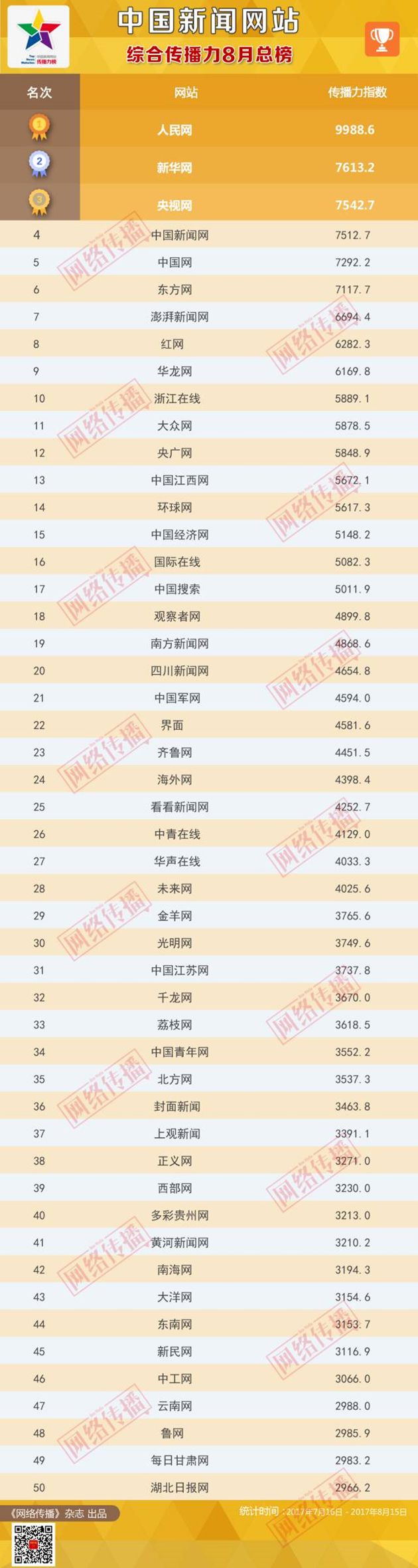 中国新闻网站传播力2017年8月总榜