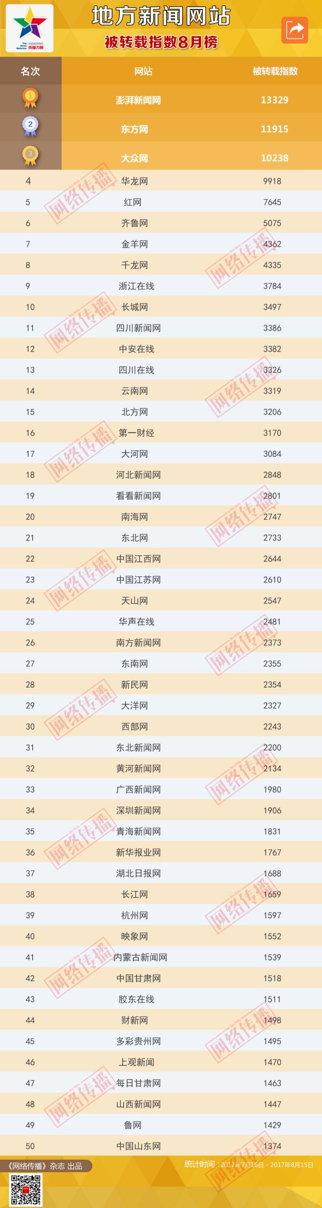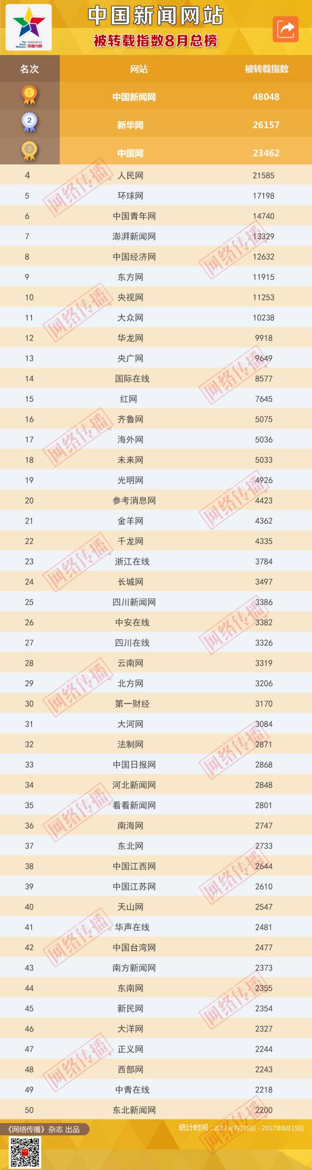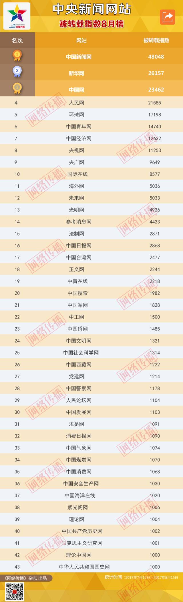 中国新闻网站被转载指数2017年8月榜