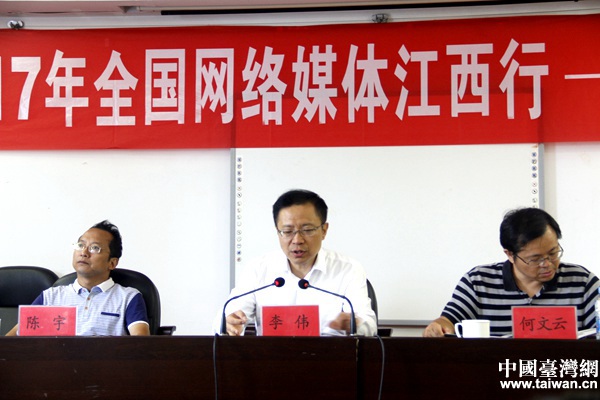 在媒体见面会上,南昌市新建区区委书记李伟(中)向记者们介绍了新建区概况。(中国台湾网 李杰 摄)