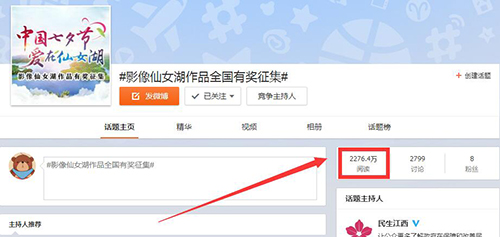 今年4月,“影像仙女湖”作品有奖征集活动启动,面向全球征集佳作,鼓励全民参与。活动启动以来,共有2780个相关话题参与讨论,微博话题阅读人数达2276.4万;微信发布数十条,阅读人数近30万;稿件经全国60余家重点网络媒体转载,总量达1000余篇,覆盖人群超8000万。征集活动启动至今,共收到影像作品近500幅,精彩微视频近30个。
