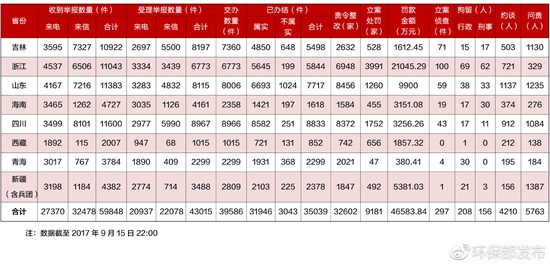 截至2017年9月15日,督察组交办的环境举报,地方已办结35039件,办结率达到88.5%。其中,责令整改32602家;立案处罚9181家,罚款46583.84万元;立案侦查297件,行政和刑事拘留364人;约谈4210人,问责5763人。