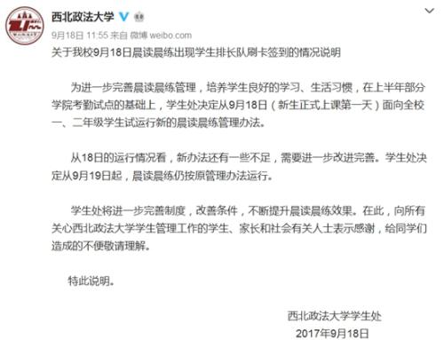 有媒体报道,9月18日一早,西北政法大学学生们为晨读打卡排起了长长的队伍。部分同学表示,几千学生,就4个打卡机能用,“成功刷脸完成晨读堪比春运抢火车票!”当日中午,学校官方微博就此事发布通告称,新的刷脸打卡的方式还存在不足,将于19日起恢复原管理办法。