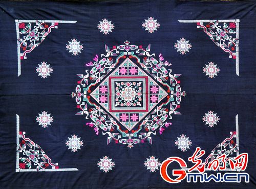 挑花(黄梅挑花) 挑花是一种具有极强装饰性的刺绣工艺。黄梅挑花又名架子花、十字挑花,广泛流传于湖北省黄梅县。黄梅挑花不同于一般刺绣,刺绣重刺,挑花重挑。黄梅挑花以元青布作底,用针将五彩丝线挑绣在底布经线和纬线交织的网格上,形成色泽绚丽、立体感强的图案。其中,针脚为“×”字形的称“十字绣”,针脚为“一”字形的称平线绣。