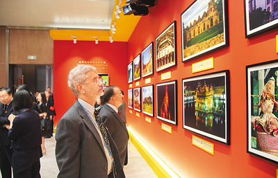 图为金砖国家领导人厦门会晤期间,外国来宾在观看金砖国家文化图片展。