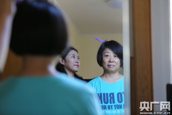 郑忠燕的一个女儿正在为她整理头发。 唐磊摄