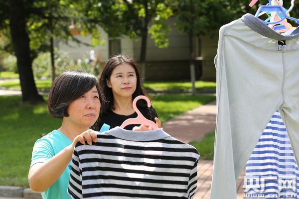 女儿在家时也会帮郑忠燕做一些家务,图为女儿和郑忠燕晾晒衣物。唐磊 摄