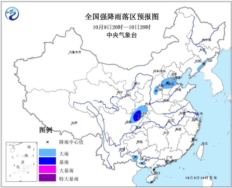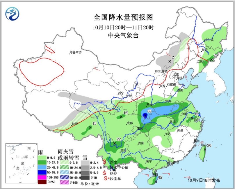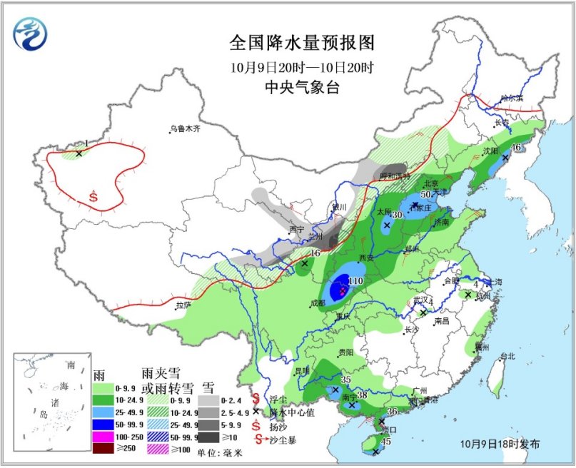 受高空槽和低层切变线影响,预计9日20时至10日20时, 四川盆地东北部、陕西南部、华北中部、辽宁东部、吉林东南部等地的部分地区有大雨,局地暴雨,其中,四川盆地东北部局地有大暴雨(100~110毫米)。海南岛、广东西南部、广西南部等地的部分地区有大雨(见图2)。中央气象台10月9日18时继续发布暴雨预报。另外,内蒙古中部、河北北部山区、陕西西北部、宁夏大部、甘肃中部、青海东部和南部将出现雨转雨夹雪或降雪,其中,宁夏南部、甘肃中部等地的部分地区有中到大雪,山区局地有暴雪。