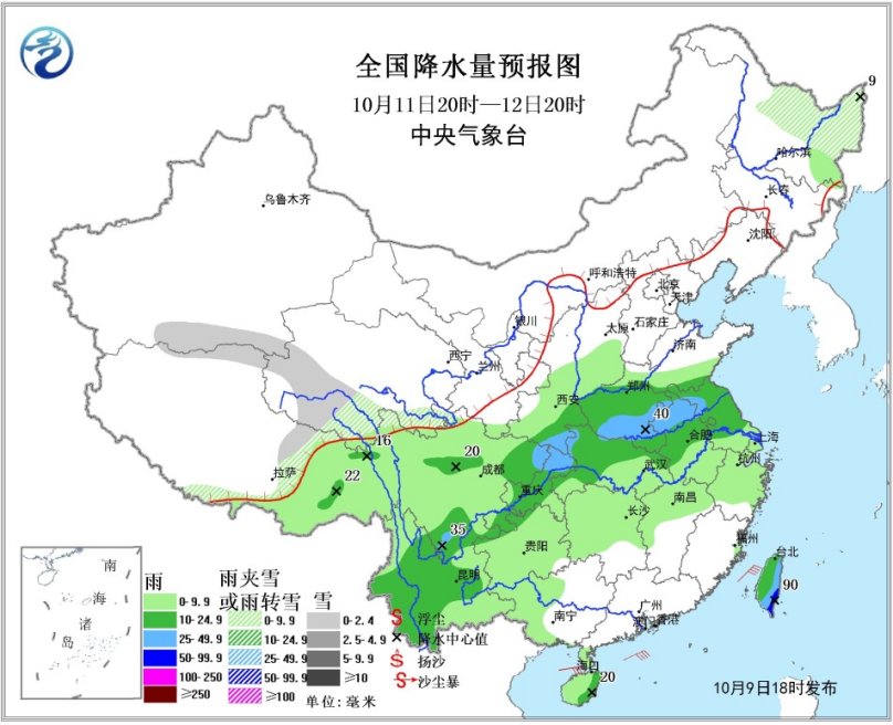 10月11日20时至12日20时,黄淮南部和西部、江淮大部、西北地区东南部、西南地区东部和南部、江汉中北部、海南岛东部、台湾等地的部分地区有中到大雨,局地暴雨;黑龙江东部、青海南部、新疆南部、西藏中部等地的部分地区有雨夹雪或小雪(见图5)。台湾海峡、东海西南部海域有7~8级、阵风9~10级的东北风。