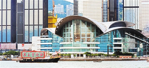 7月1日,巡游渔船从香港会展中心前驶过。新华社记者 卢炳辉摄