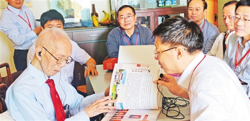 “中国百校之父”田家炳(前左)在家中接待内地田家炳中学校长访港团。 新华社发