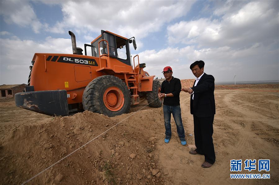 在宁夏盐池县曾记畔村,朱玉国(右)在工地查看村饲料加工厂的建设情况(10月20日摄)。(新华社记者 李然 摄)