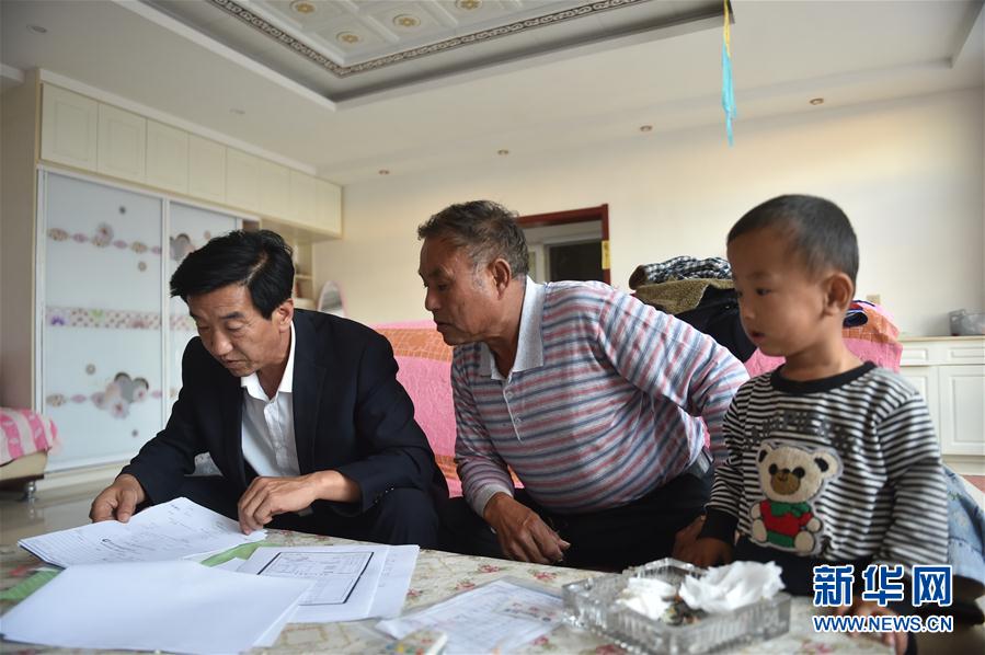 在宁夏盐池县曾记畔村,朱玉国(左)在村民家中了解脱贫情况(9月20日摄)。(新华社记者 李然 摄)